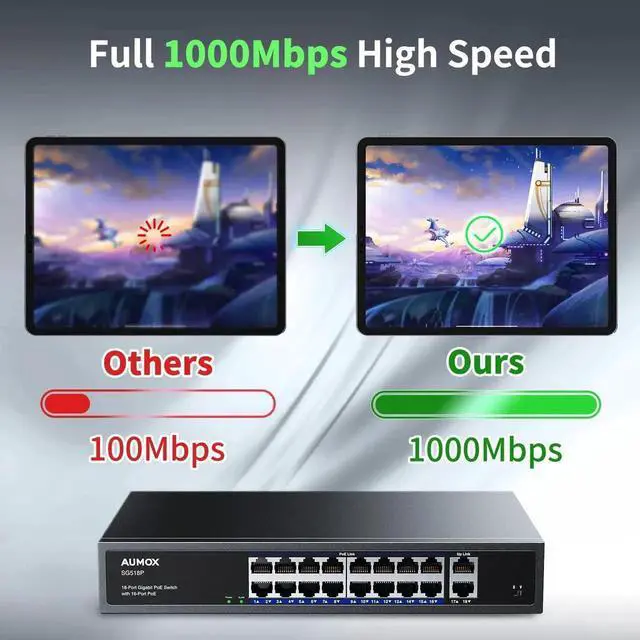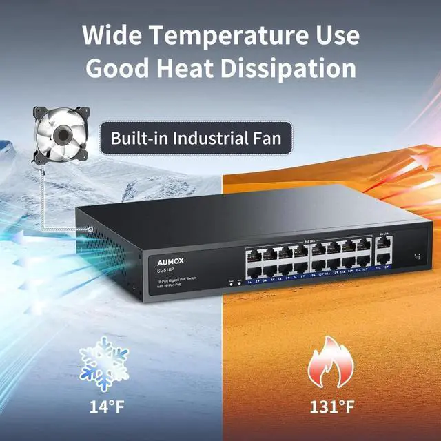 Aumox 18-Port Ethernet Gigabit PoE Switch, 16-Port PoE with 2 Uplink Gigabit Ports, 250W Built-in Power, Metal Casing and 19-inch Rackmount, Traffic Optimization, Plug and Play, Unmanaged (SG518P)