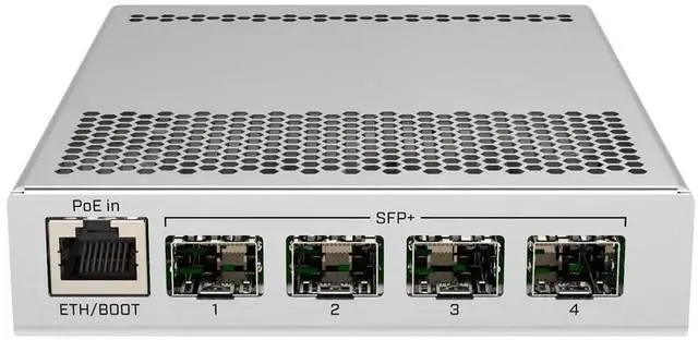 The CRS305 is a compact yet very powerful switch, featuring four SFP+ ports, for up to 10 Gbit per port. The device has a 1 Gbit copper ethernet port for management access and two DC jacks for power redundancy. The device is a very sleek and compact metallic case without any fans, for silent operation. The device has a Dual boot feature that allows you to choose between two operating systems - RouterOS or SwOS. If you prefer to have a simplified operating system with only switch specific features, use SwOS.