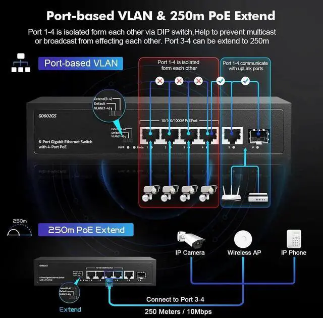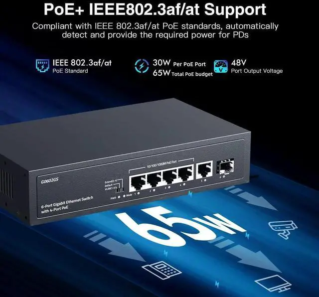 YuLinca 6 Port Gigabit PoE Switch, 4 Gigabit PoE+, 1 Gigaibt Uplink, 1 Gigabit SFP, IEEE 802.3 af/at, Max 65W, VLAN & PoE Extend 250m, Fanless Plug & Play Ethernet Switch
