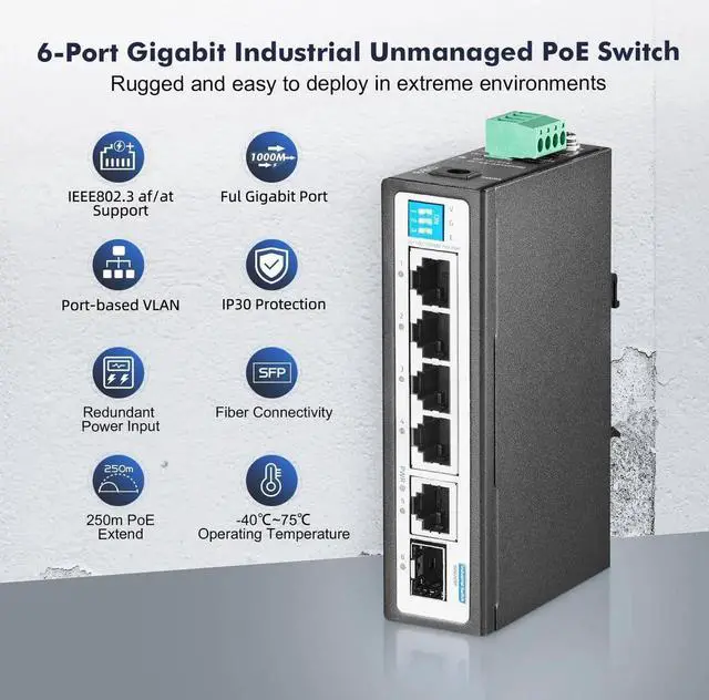 YuLinca 6 Port Mini Gigabit Industrial DIN-Rail PoE Switch, 4 x 100/1000Mbps PoE Ports, IEEE 802.3 af/at PoE+, 1 Gigabit Uplink, 1 Gigabit SFP, Unmanaged IP30 (-40~185°F) Hardened Industrial Switch