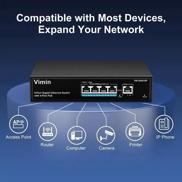 4 Port Gigabit PoE Switch with 1 Uplink Gigabit Ports, VIMIN 5 Port Unmanaged Ethernet PoE Switch with 72W Power, Support IEEE 802.3 af/at, VLAN, Metal Housing, Desktop or Wall-Mount, Plug & Play
