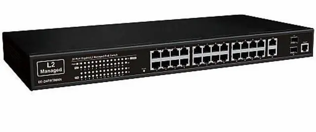 UltraTech's Gigabit L2 Managed PoE Switches deliver enhanced traffic management capabilities for faster, smoother data transfer. This twenty-eight port switch is equipped with twenty-four gigabit PoE ports with sufficient power for any application and four uplink ports for flexible link.