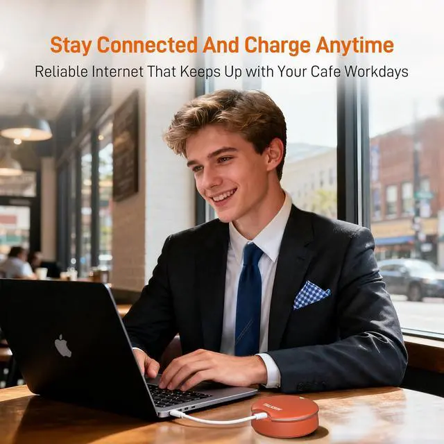 Ultra-Portable Design & Charge On-the-Go: Engineered for mobility, the UFO mobile hotspot device's sleek, lightweight design travels effortlessly in your pocket. UFO hotspot device stays powered up and online by power base, or plugging it into any power bank or outletenjoy continuous internet in a café, car, or airport without missing a beat. (No connect fast charging cable)