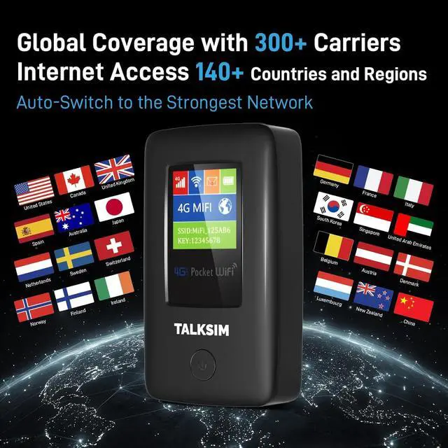 Global Coverage in 140+ Countries & 300+ CarriersTALKSIM 4G portable WiFi supports seamless coverage in 140+ countries and regions across all continents (America, Europe, Asia, Africa, and Oceania) via access to 300+ global carriers. This mobile WiFi hotspot automatically selects the strongest local carrier signal to ensure stable, high-speed internet connectivity wherever your travels take youno more switching for local SIM cards or dealing with weak networks abroad.