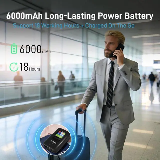 10-Device Sharing & 6000mAh Long-Lasting BatteryConnect up to 10 devices (smartphones, laptops, tablets, etc.) simultaneously with encrypted secure WiFi, without unsafe public networks. Equipped with a powerful 6000mAh battery, this portable hotspot device delivers up to 18 hours of continuous use on a single charge and keep your devices charged on the go. This on the go portable WiFi is perfect for group travel, family road trips, business teams, and remote workers who need shared, reliable connectivity all day long.