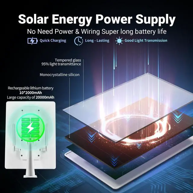 High-Quality Lithium BatteryEquip with a 20000mAh rechargeable lithium battery, it guarantees extended usage even during continuous cloudy days,This battery boasts a lifespan of up to 500 recharge cycles, backed by a built-in protection circuit for safety.