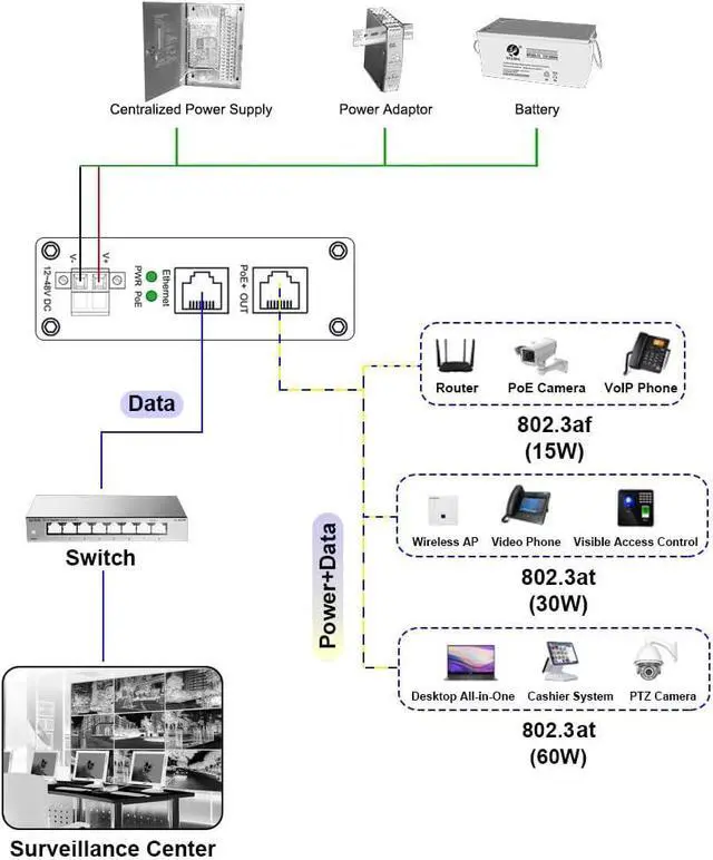 Both the Ethernet port (to switch) and the PoE Out port (to PoE device) support 10/100/1000Base-T and are compliant withI EEE 802.3ab. The PoE Out port compliant with IEEE 802.3 af/at. The POE adapter provides an integrated power solution with 12~48VDC wide range voltage input.