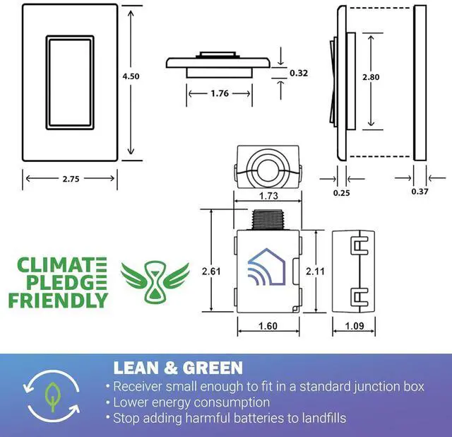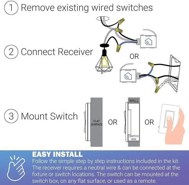Simple DIY Installation Works with Standard Faceplates Install the receiver at the fixture, and mount the switch anywhere you wanton a wall, over an existing junction box, or even on glass or tile. Installs in minutes and fits standard Decora faceplates.