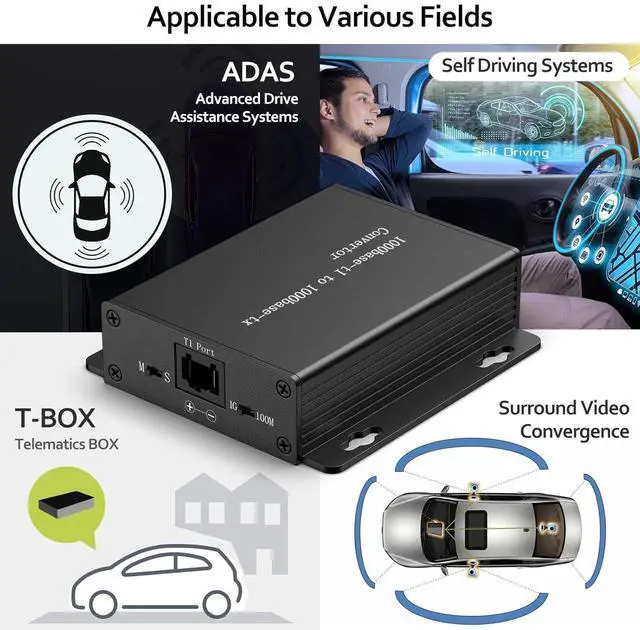 The device features bi-directional conversion between Standard Ethernet (1000BASE-TX) and Automotive Ethernet (1000BASE-T1).