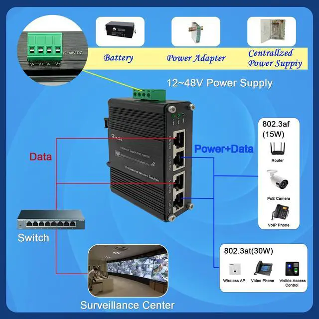 The 2Ch PoE+ Injector Supports Wide Input Voltage12~48V DC