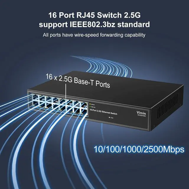 2.5Gbps Network Switch: VIMIN 16 Port 2.5G unmanaged network switch offers 16x 2.5Gbase-T ports , providing fast and reliable network connectivity with a 120Gbps ethernet switching capacity. Ports 1-16 comply with the IEEE802.3bz (2.5G) standard, support 10/100/1000M/2.5G adaptive.