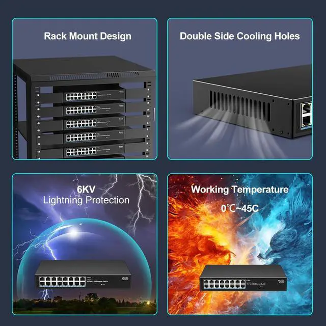 Durable and Silent Design: The VIMIN 16 port 2.5G switch features a sturdy metal housing that offers excellent durability and heat dissipation. 4KV lightning protection design. With a fanless design, it operates silently, making it suitable for noise-sensitive environments.