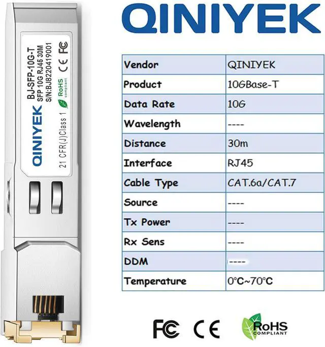 QINIYEK 10G-SFP-T copper transceiver module is a high performance integrated duplex data link for bi-directional communication over copper cable. It is specifically designed for high speed communication links that require 10 Gigabit Ethernet over Cat 6a/7 cable. This is the first SFP+ transceiver that offers 10 Gb/s communication over this type of media.