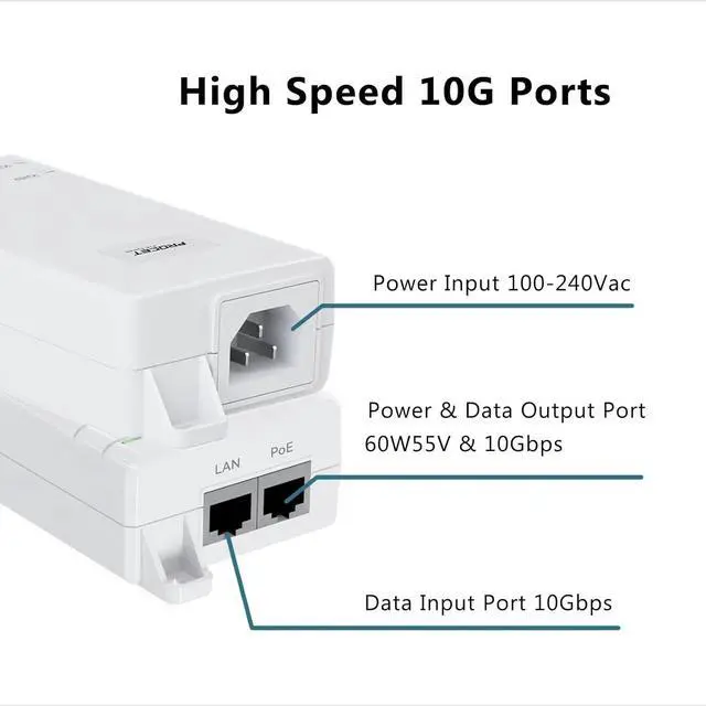 Gigabit PoE Injector 1 Gigabit Ethernet Input Port + 1 Gigabit Ethernet Output port , Support 10/100/1000Mbps of data speedprotect output against over voltage, over current, short circuit