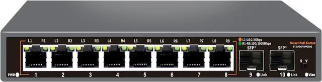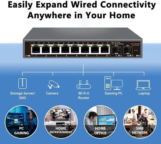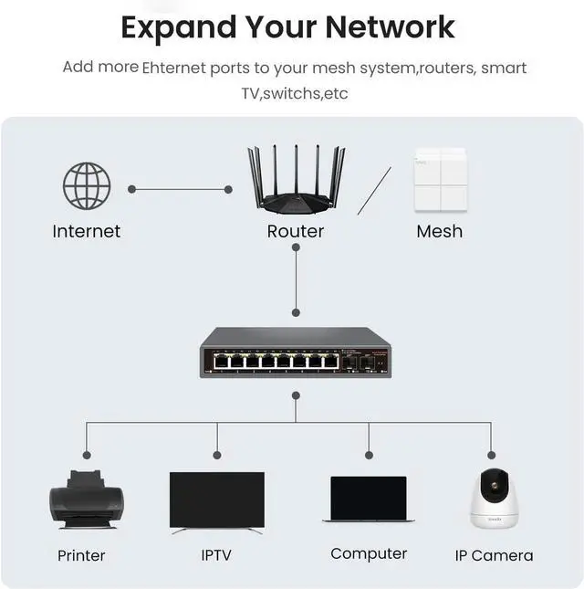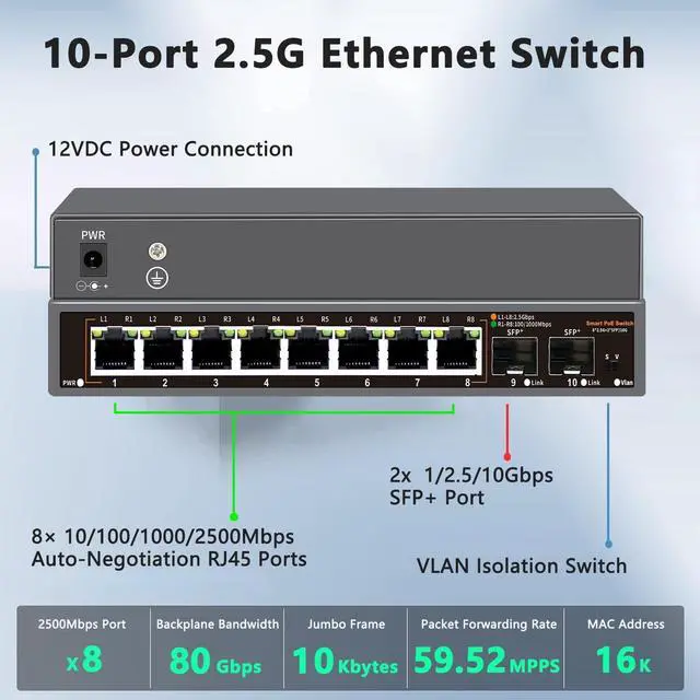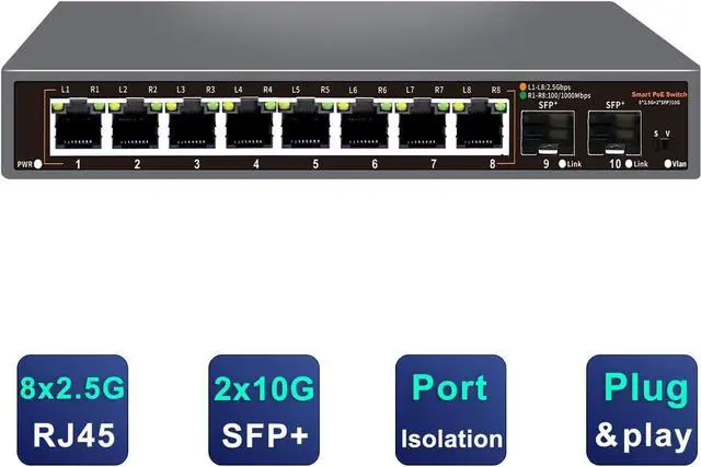 8 Port 2.5G SwitchEquipped with 8 10/100/1000/2500Mbps RJ45 adaptive ports, Equipped with 2 1/2.5/10G Uplink SFP+ port, 60Gbps switching capacity to meet the broadband needs of more devices, build more stable and larger network,supporting full/half duplex self negotiation transmission mode, seamless Ethernet connection, expand network capacity and provide more stable and efficient data transmission between ports.