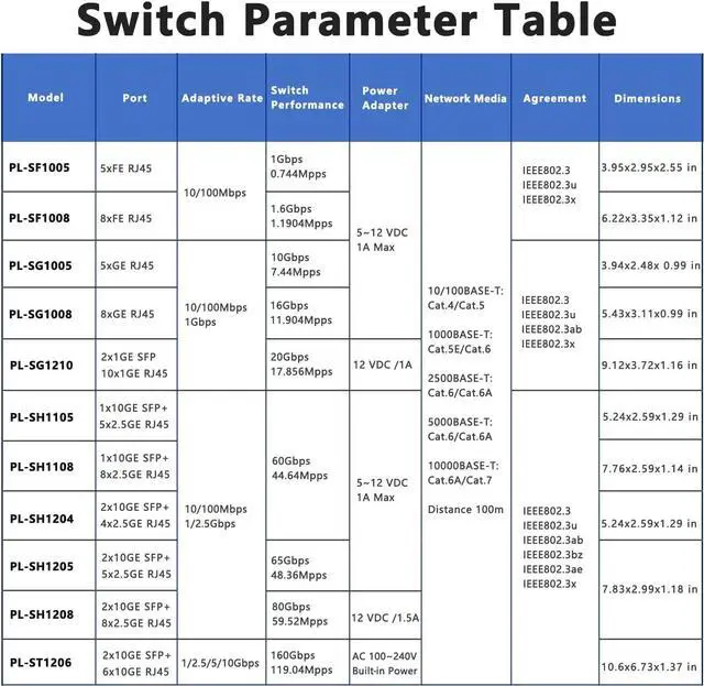 Unmanaged SwitchEach port supports MDI/MDIX auto-flip and duplex/rate auto-negotiation, compliant with IEEE802.3IEEE802.3iIEEE802.3xIEEE802.3zIEEE802.3abIEEE802.3aeIEEE802.3bz ethernet standards, Excellent data forwarding performance.
