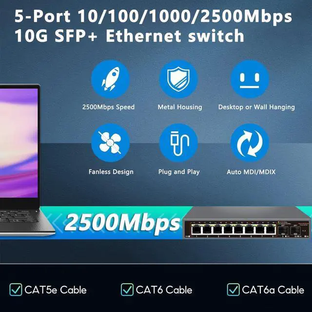 Plug and PlayFool type switchPLUG-AND-PLAY - Easy setup with no software installation or configuration needed. LED panel indicator, dynamic display device connection and running status, installation and maintenance are very simple, more convenient to use.No need to upgrade to Cat6 cabling, instantly upgrade to 2.5 Gbps performance, reducing cabling cost and hassle.