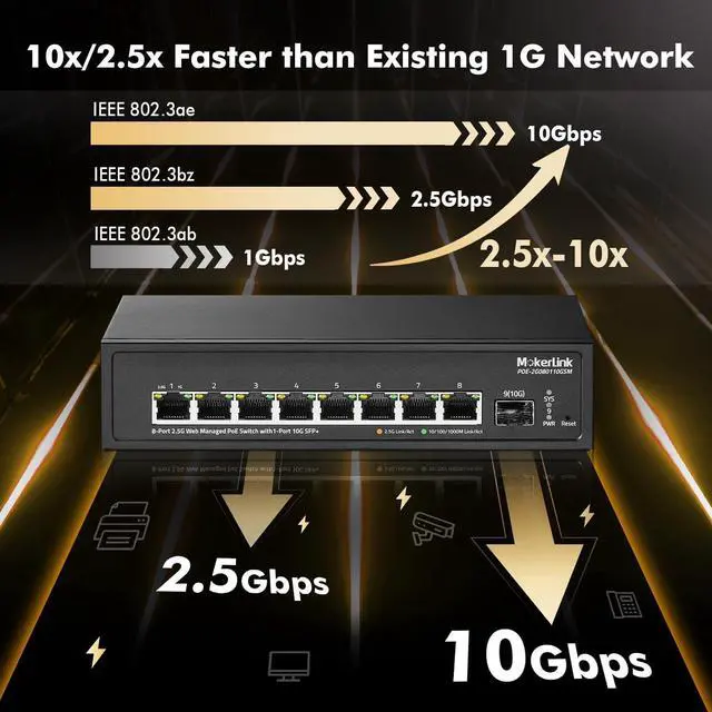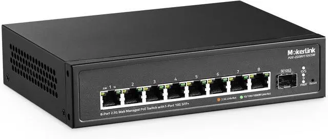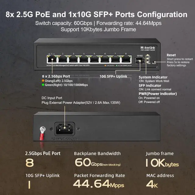 8x2.5G Ports: The network switch has 8 x 2.5Gigabit Ethernet Ports, compliant IEEE802.3bz (2.5G) standard, support 10/100/1000M/2.5G adaptive. 1 x 10G SFP+ Port(compatible 1G/2.5G Module, not include SFP Module). 60Gbps backplane bandwidth, excellent data forwarding performance
