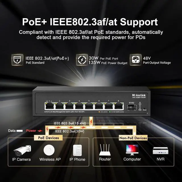 8 PoE Ports: Port 1-8 support IEEE802.3af/at PoE, each port max 30W, built-in power supply makes installation easier, whole Power 135W. *Please note: not support passive 24V PoE.*