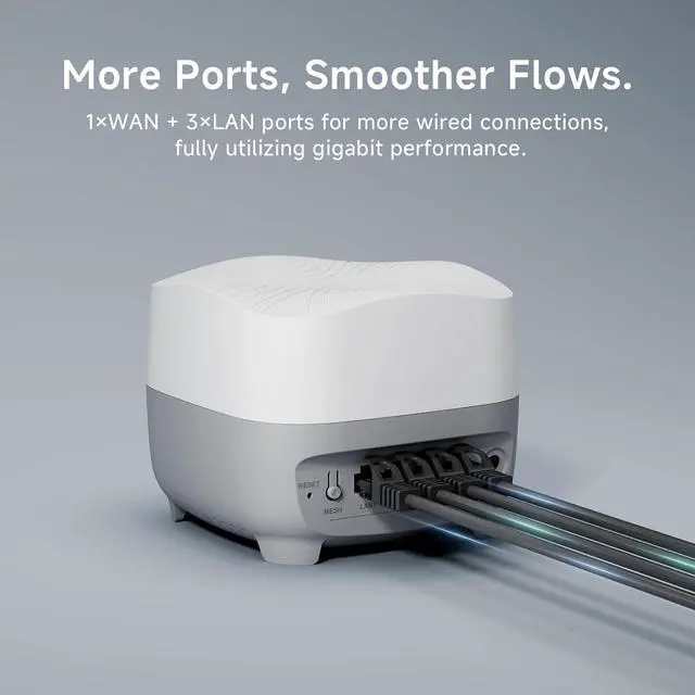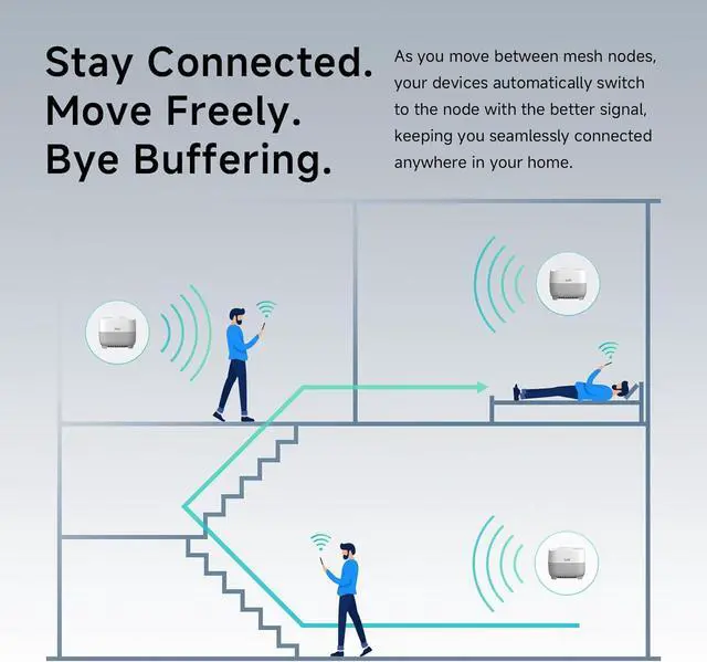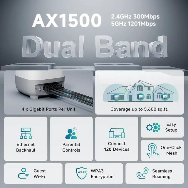- : Enjoy ultra-stable Wi-Fi in every corner with the AX1500 Mesh System 3-Pack, eliminating dead zones across large homes (up to 5,600 sq ft). With smart roaming technology, your devices switch smoothly between nodes without dropped connectionsa superior solution compared to standard WiFi boosters and extenders