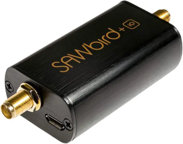 The bundle includes SAWbird+ iO (dual LNA and filter in aluminum enclosure), a high gain Inmarsat patch antenna, an SMA DC block, a male SMA to male SMA barrel adapter, a male SMA to male SMA pigtail cable, a micro USB cable, and a micro USB to barrel connector cable