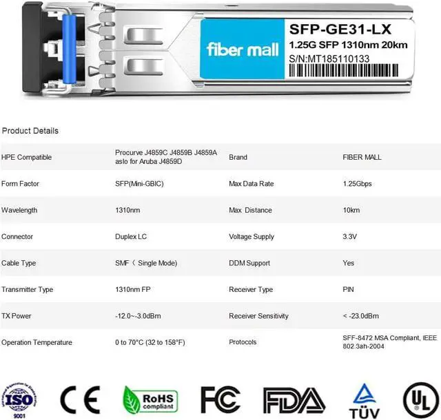 1G SFP module sfp transceiver module supports 1.25Gbps data rate and 10km transmission distance through SMF. The transceiver is compatible with HPE ProCurve, has SFP multi-source protocol and SFF-8472 digital diagnostic function, conforms to SFF-8472 MSA, conforms to IEEE 802.3ah-20044