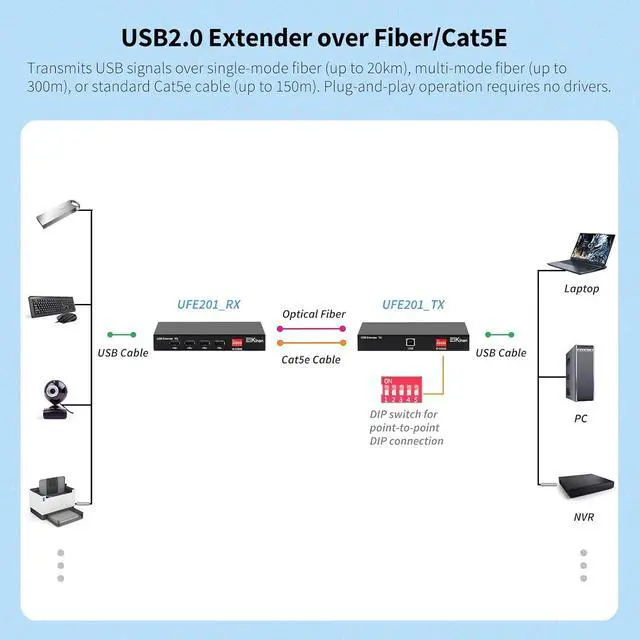 This USB 2.0 extender over fiber ethernet enables reliable extension of USB signals over significant distances using either fiber optic or Cat5E cable. It supports transmission up to 20km with single-mode fiber, 300m with multi-mode fiber, and 150m over a standard Cat5E network cable. This versatility makes it suitable for various environments, including home entertainment, gaming setups, industrial automation, and office workstations.