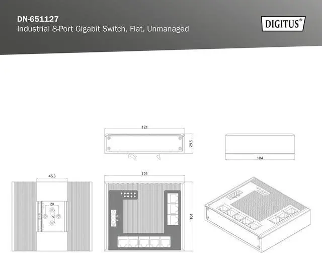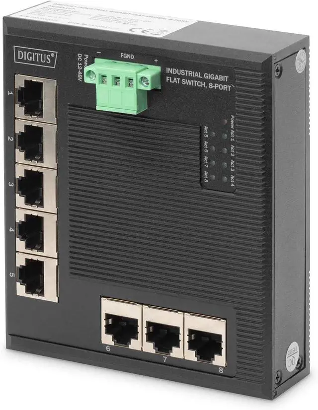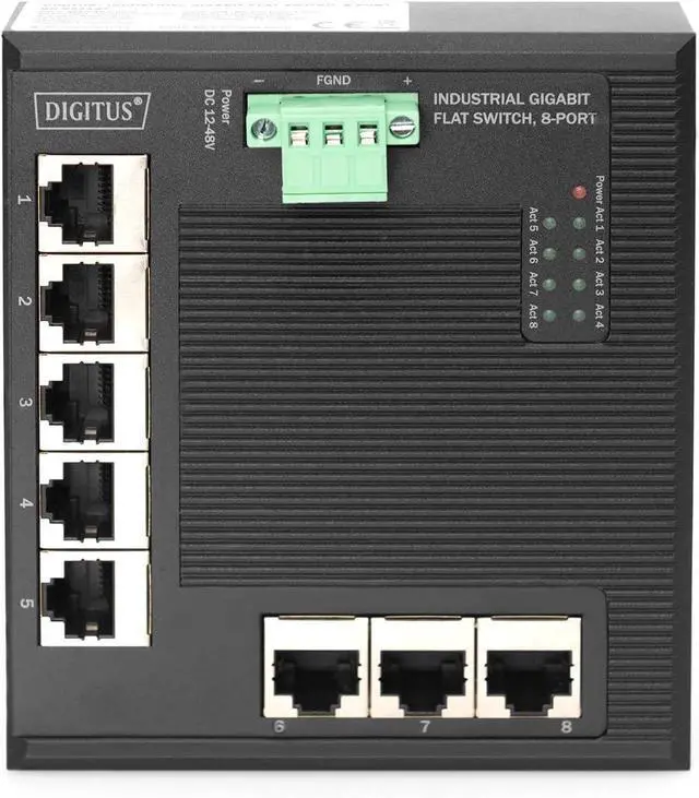 The DIGITUS® Industrial Flat Gigabit Switch was developed for harsh environments in which it is exposed to moisture, temperature fluctuations and vibrations. With a temperature range from -40 °C to 85 °C, the Industrial Flat Gigabit Switch can be used under the most adverse of conditions. The flat, fanless casing saves space and additional energy costs. It guarantees constant availability in highly sensitive sectors such as transport, production, transport and security surveillance. The simple plug and play system lets the Industrial Flat Gigabit Switch be quickly integrated into the respective environment. With its gigabit connectivity, the Industrial Gigabit Switch is a flexible and cost-effective solution for industrial environments.