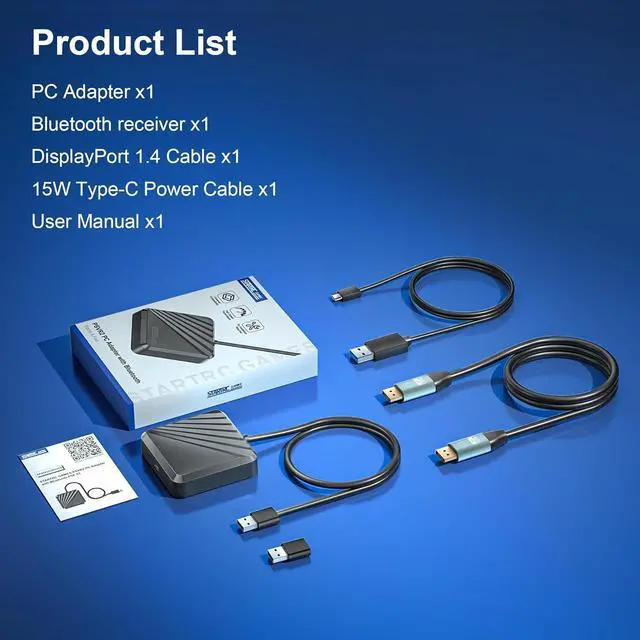 What's in the Box: PC Adapter x1, Bluetooth receiver x1, DisplayPort 1.4 Cable x1, 15W Type-C Power cable x1, User Manual x1.If the product fails to connect or has abnormal connection during use, please contact us in time and we will provide the best after-sales service.