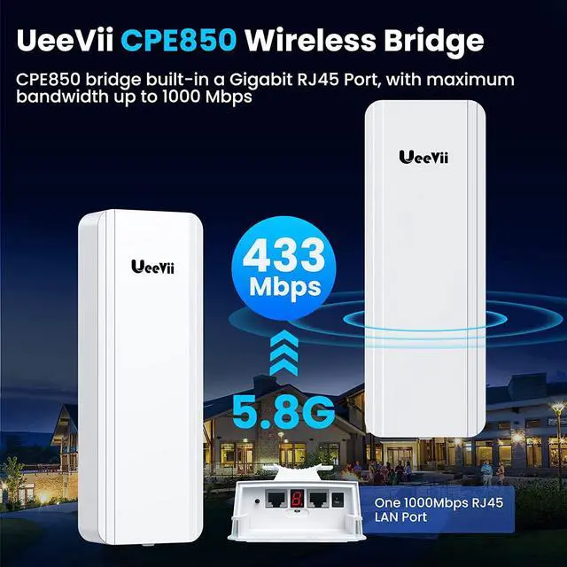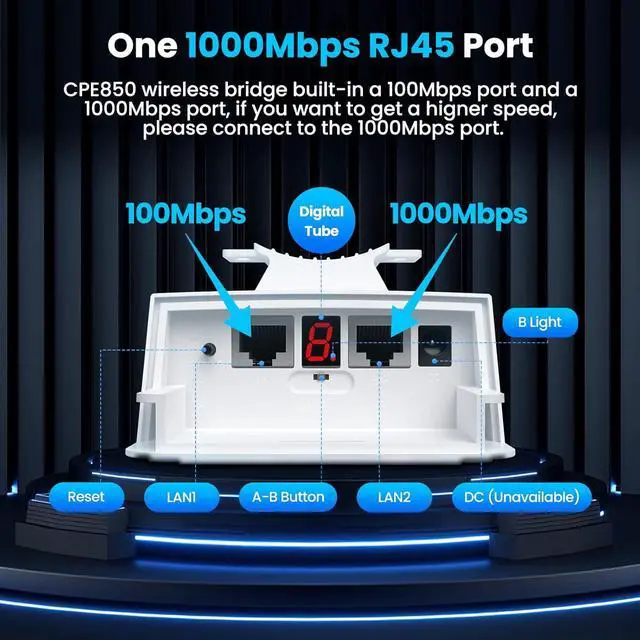 5G Gigabit Wireless Bridge: The CPE850 is a 5G outdoor CPE designed for long-range WiFi extension, it supports lightning-fast data transfer rates of up to 1200Mbps between bridges, and the maximum achievable network speed is 450Mbps