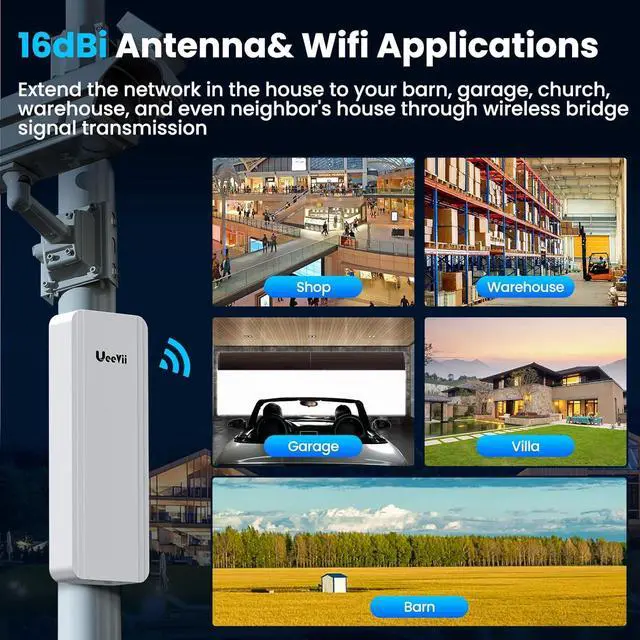 Network and Surveillance Expansion: This point-to-point internet bridge facilitates seamless network extension to secondary buildings like barns, shops, garages, or warehouses, as well as wireless expansion of IP camera surveillance ranges