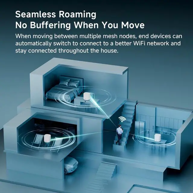 - : Three units cover up to 6,500 sq. ft. with ultra-stable WiFi. Add satellite units to eliminate dead zones and enjoy smooth roaming between rooms, floors, or outdoor spaces. A better solution than standard WiFi boosters and extenders