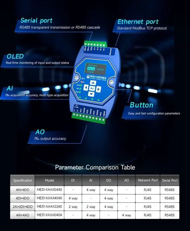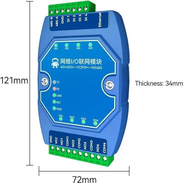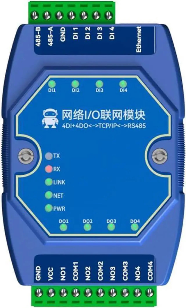 ME31-AXAX4040 is a network I/O networking module with 4-way A relay output and 4-way dry connection input detection, supporting Modbus TCP protocol or Modbus RTU protocol, and the device can also be used as a simple Modbus gateway (automatically issuing non-native Modbus address instructions via serial / gateway).