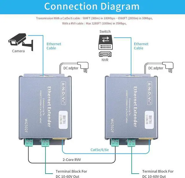 Transmission DistanceThe extension distance will be Max 6560FT(2000m) When transmission for using a Cat5e Cat6 Cat6e network cable. The extension distance will be Max 3280FT(1000m) when transmission with a RVV cable.