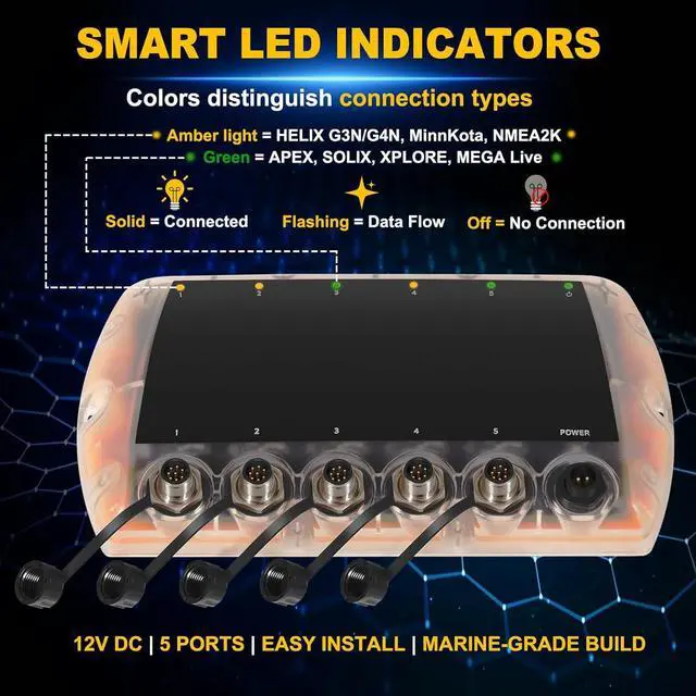 Intelligent Status LEDs Real-Time Connection Monitoring Each port has smart LED indicators: Solid = Connected, Flashing = Data Transfer, No Light = Not Connected. Amber and green colors distinguish connection types.Amber light = HELIX G3N/G4N, MinnKota, NMEA2K. Green = APEX, SOLIX, XPLORE, MEGA Live. Helps identify connectivity at a glance.