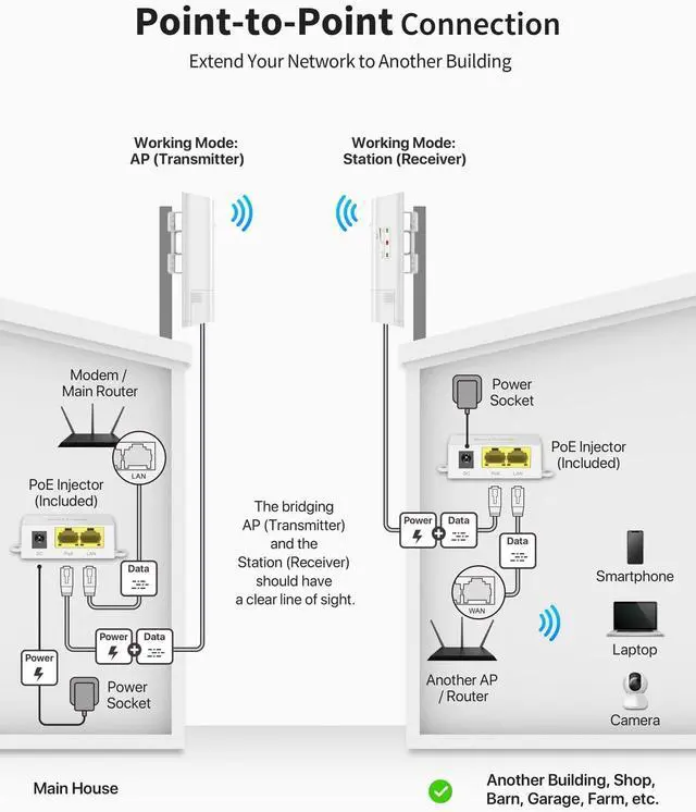 1 km Long Range Connection: The outdoor WiFi bridge provides stable signal transmission up to 1 kilometer, with a clear line of sight. It extends the network between buildings, from your house to a shop, barn, garage, shed, farm, RV, or any outdoor structure