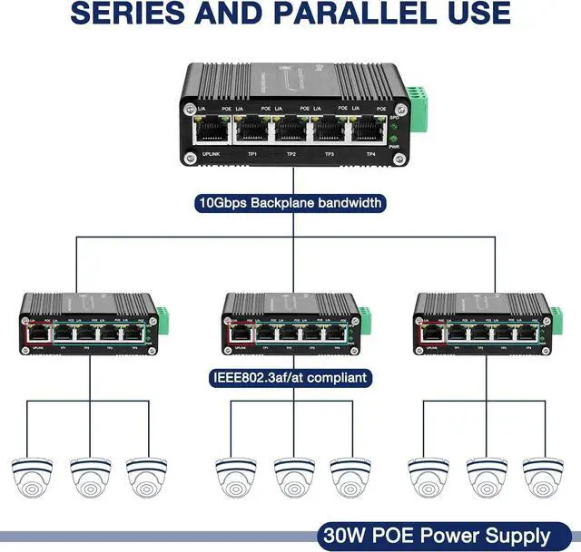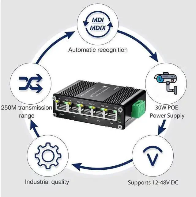 : 5 port industrial poe switch compact IP40 rugged metal enclosure,excellent heat dissipation; Wide working temperature (-40 to 176 ), can use it in outdoor harsh environment