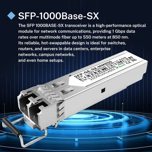 4. Wide Application Scope: Suitable for enterprise networks, data centers, and home network setups alike. It supports both 62.5um and 50um LC fiber cables and is compatible with OM1, OM2, OM3, and OM4 fiber types, meeting the connectivity requirements of diverse 1Gbps SFP port-equipped devices.