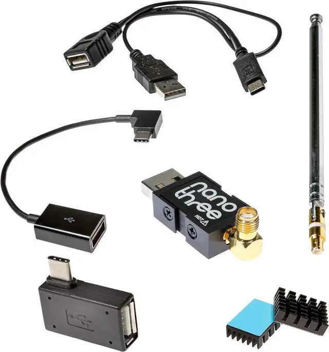 • Includes NESDR Nano 3 in an anodized aluminum enclosure, 1 nano-sized antenna, 3 USB OTG adapters. 1 heatsink and an articulating adapter for SMA antennas