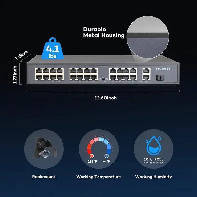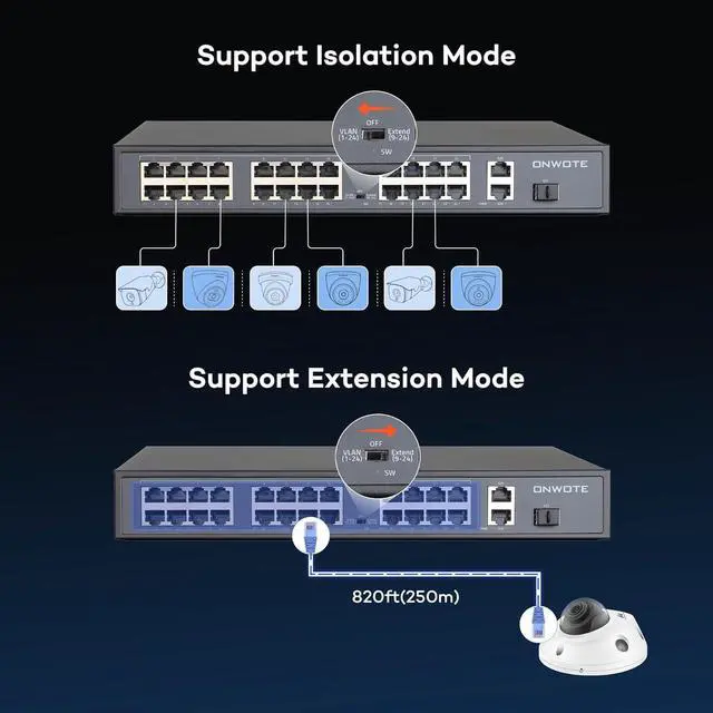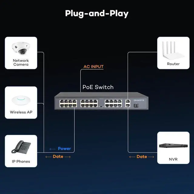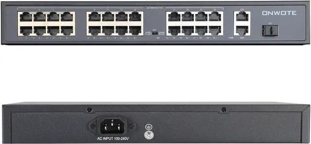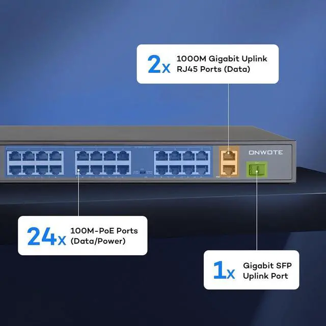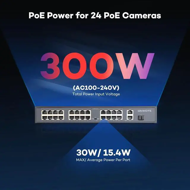 ONWOTE 24 Ports Ethernet PoE Switch @300W, 2X Uplink Gigabit RJ45 Ports, 1X SFP Slots, Support 4K 8MP 5MP 1080P IP Security Cameras, Add-on Injector to NVR System