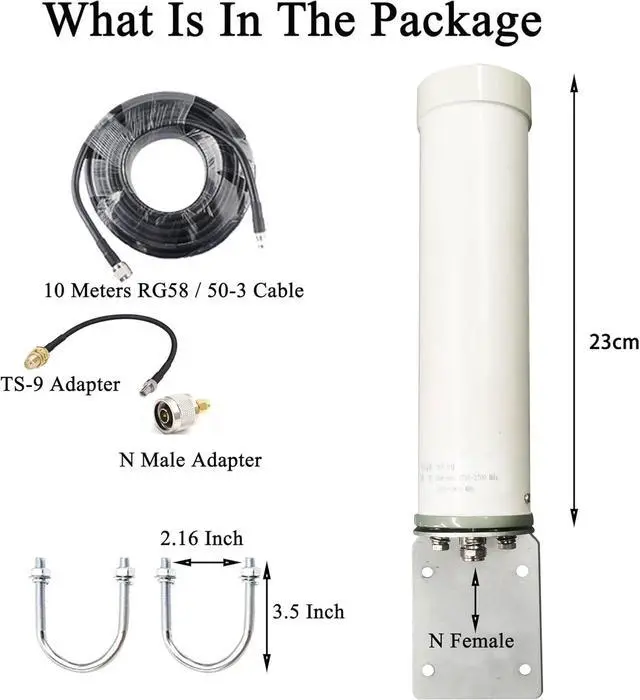 What You Get : 1 x wifi 5G 4G LTEAntenna &1 set bracket hardware & 1x 10meters 50-3 Cable & 1x N male adapter & 1xTS-9 adapter .