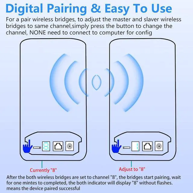 [Plug and Play]: The Plug and Play feature of the Point to Point Wireless Bridge revolutionizes installation with its intuitive design, catering to users across all proficiency levels. By eliminating the complexities of traditional setups, it ensures effortless deployment without the necessity for specialized technical skills. Its seamless integration capability into existing networks further enhances convenience, enabling swift expansion or enhancement of connectivity without disruption.