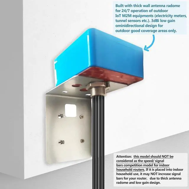 Note: 1. The antenna is designed for long time outdoor operation of IoT/M2M equipments electricity meter etc.in good coverage area only. It should NOT be considered as an indoor speed competition aerial option. 2. After connecting the antenna, please turn on the external antenna function of the router. 3. Outdoor mount at premier locations is strongly preferred to avoid signal blockage by walls, as shown in A+ content. 4. Please consider our panel antenna models instead if your signal level is low below 2 bars.
