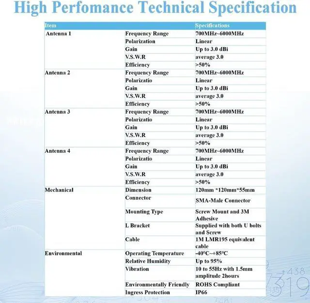 Wide range of applications: It has an ultra-wide frequency band and is compatible with cellular network, Bluetooth, WiMAX, Zigbee, WiFi 6E, and WiFi 7 technologies. It is very suitable for RV camping, urban and rural 5G, coverage enhancement systems, and various IoT and M2M network equipment for industrial and commercial purposes. Compatible with all routers, modems, CPE, WAP, smart meters, in-vehicle network equipment, smart agriculture, IoT and M2M devices.
