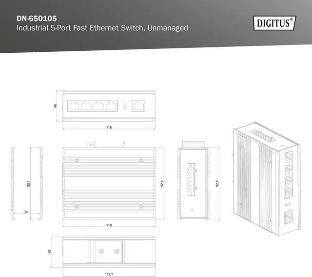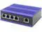 The industrial Ethernet Switch has 5 RJ45 ports with fast Ethernet speeds and comes in a robust, compact black and blue metal case.