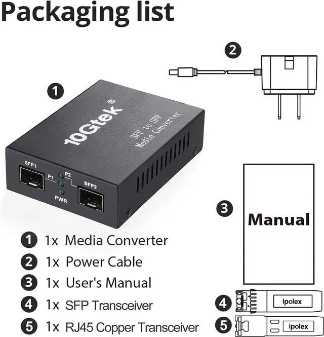 What you get: A 10 Gigabit Fiber to Fiber Media Converter, A 10GBase-T SFP+ Transceiver, A 10GBase-SR SFP+ Transceiver, A Power Supply.
