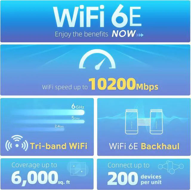 Support WiFi 6E Backhaul: Ensure higher wireless internet speed of mesh system. Enjoy the benefits of WiFi 6E now with your existing WiFi devices