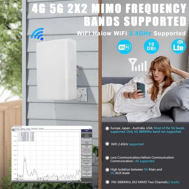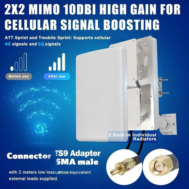 High Gain & Long-Range Coverage: 10dBi directional design targets weak cellular signals up to 10km, optimized for rural/remote areas. MIMO 2x2 cross-polarized technology improves data throughput for stable 4G/5G and WiFi 2.4GHz connectivity
