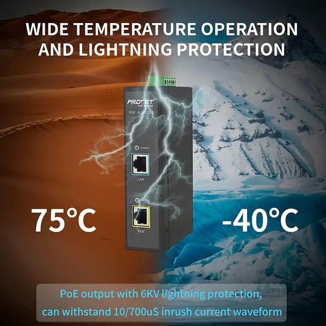 PoE 6KV Surge ProtectionPoE port 6KV surge protection, protect output against over voltage, over current, short circuit.
