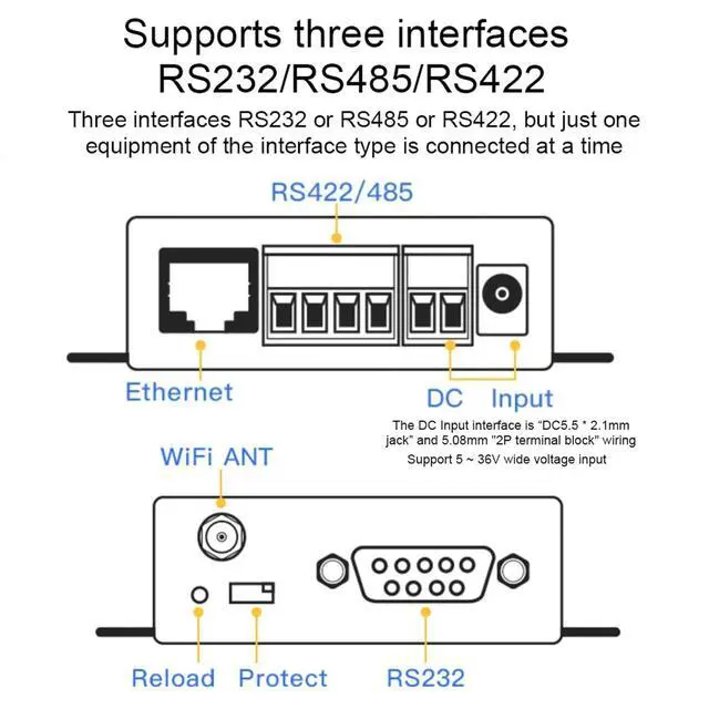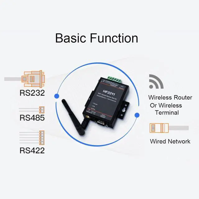 Serial Interface Parameters: Number Of Serial Ports: 1 (RS232 / 485/422) Interface Standard: RS232: DB9 pin type RS485 / RS422: 5.08mm terminal block Baud Rate: 600-230400bps Data Bits: 8 Stop Bits: 1, 2 Parity: None, Even, Odd, Space, Mark Wi-Fi Interface Parameters: Standard: 802.11 b / g / n Network Mode: for STA / for AP / for STA + AP Network Protocol: For TCP / for UDP, etc. Maximum Number Of Connections: Maximum 15 STA